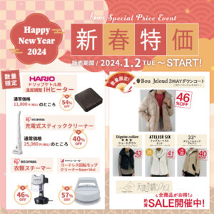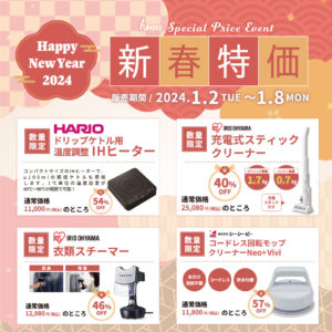 EVENT&NEWS 2024年01月02日 【数量限定】2日間限定の新春特価!! 2023年12月29日 HARIO商品をプレゼント! プレゼントFair♬ 2023年12月28日 Winter Sale 初売り Max 30% OFF ‼ 2023年12月26日 2024年末年始 営業時間・休業日のお知らせ 2023年12月25日 2024年ハウズの初売り!新春特価!! 2023年12月25日 【数量限定】新春特価!!-雑貨・家電ー 2023年12月25日 【数量限定】新春特価!!ーアパレルー 2023年12月21日 野菜のポタージュ プレゼント♪