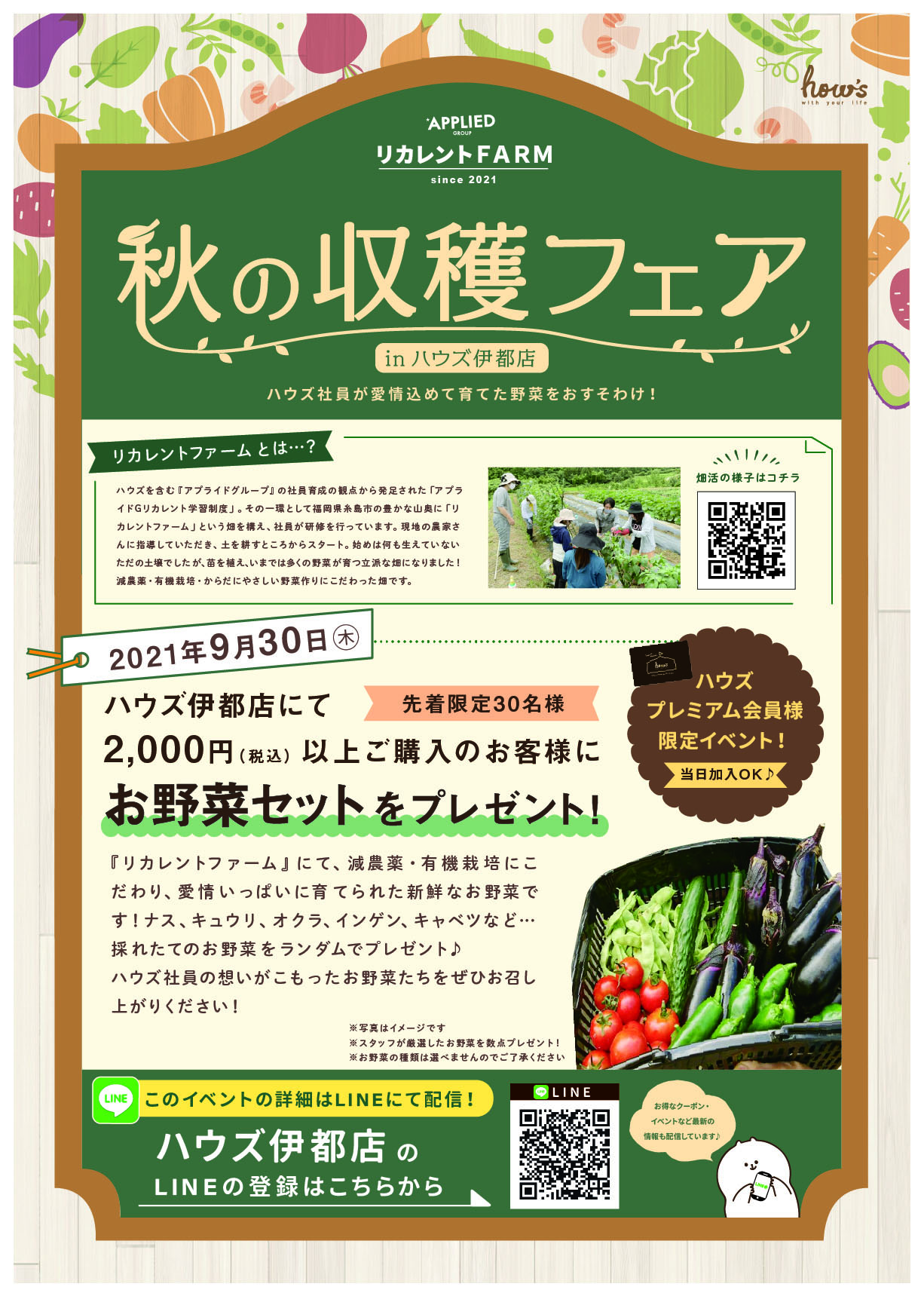 9月30日(木) ハウズ伊都店限定!プレミアム会員様 秋の収穫フェア! ハウズ自社農園『リカレントFARM』のご紹介 ハウズ自社農園 リカレントFARMの詳細はこちらからも↓ http://recruit.applied-g.jp/2022/recurrent1/ 9/30(木)は毎月30日、『プレミアム会員様の日』商品のご購入もお得! 前の記事 【9月25日新発売!】ハウズオリジナル『グルテンフリー 米粉パンケーキミックス』 次の記事 【2021.10.3㊐】お客様感謝デー